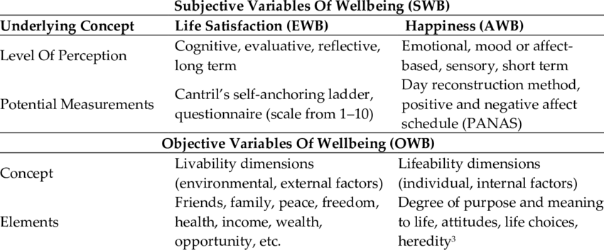 Eger and Maridal (2015) conducted a statistical meta-analysis of 560 studies on wellbeing. They divided subjective wellbeing again in affective wellbeing (referring to hedonic concepts) and evaluative wellbeing (which they saw as being closer to eudaimonia). Out of the 560 publications analysed, 132 focused on affective wellbeing and 428 on evaluative wellbeing. LS falls into the latter category. Table 1 (Eger & Maridal, 2015) demonstrates the division of subjective wellbeing and objective wellbeing as well as evaluative wellbeing (EWB) and affective wellbeing (AWB). Table 1: Classification of wellbeing concepts.