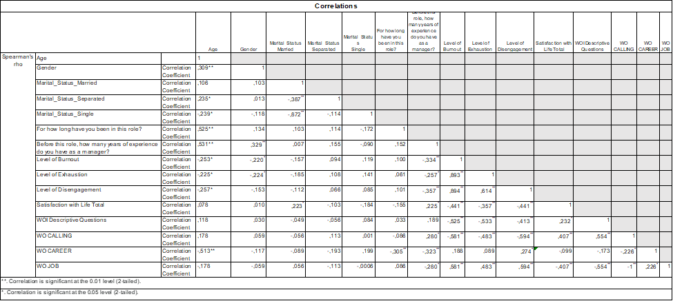 The independent variable of number of years of experience as a manager presented several significant relationships, starting with a moderately negative relationship with burnout (r=-.33**), EE (r=-.25*) and DE (r=-.35**) followed by a positive relationship with LS (r=.22*) and calling WO (r=.28*) and a negative relationship with career WO (r=-.32**) and job WO (r=-.28*).