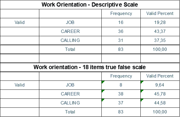 Secondly the results obtained via the three subscales of the 18-item true/false questionnaire were looked at in comparison to the three-item descriptive scale. On the one hand, 45.7% of respondents (n=38) presented similar trends for career orientation. On the other hand, job orientation differed by almost 10 points for 9.6% of the respondents (n=8) and calling orientation differed by seven points for 44.5% of respondents (n=37), (Mean=24.7, SD=3.6).