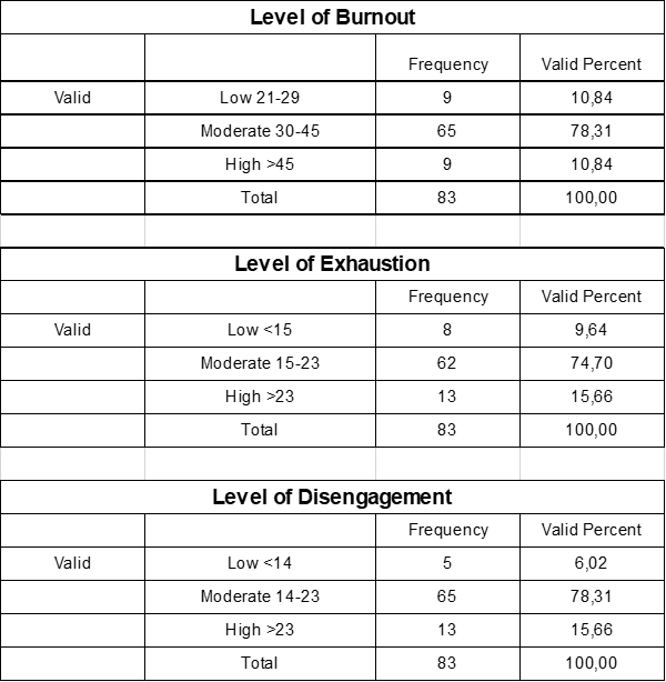 Table 3: Levels of burnout, EE and DE.